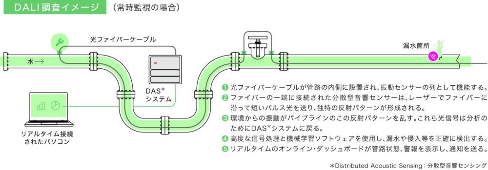 DALI は、重要管路・⼤⼝径管路向けの光ファイバー漏⽔検知システムで、分散型⾳響センシング技術によって管路の漏⽔を正確に検知することを可能にしました。⾼度な管路の維持管理を実現し、無収⽔量の削減と、資産の耐⽤年数を延ばすことができます。