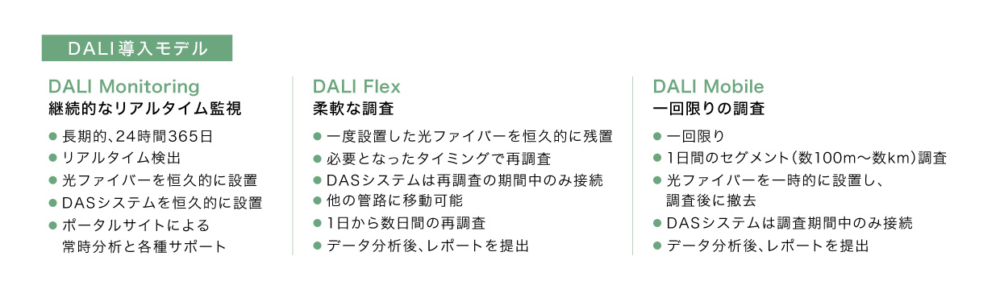 「DALI」は、⽔道管路内に挿⼊した光ファイバー⾃体を、連続的な「振動センサー」として活⽤する漏⽔検知システムです。センサーが捉えたデータを DAS※1システムで解析し、⾞両の通⾏⾳などの環境ノイズの中から、漏⽔特有の信号を抽出します。漏⽔の検知精度は 5m で、⼤⼝径管や重要管路の監視に最適です。管種や材質を問わず解析が可能なため、⼤規模漏⽔や管体破断の未然防⽌、ひいては管路の資産管理の⾼度化に寄与します。また、独⾃開発の挿⼊システムにより現場状況に応じた柔軟な設置が可能で、使⽤する光ファイバーは飲料⽔への適合承認※2 も取得しており、安全性にも配慮されています。今回は、データ取得後にケーブルを回収する⼀度限りの調査でしたが、システムの採⽤にあたっては常時監視や定期調査、1回限りなど、ニーズに合わせた3つの導⼊モデル※3を⽤意しています