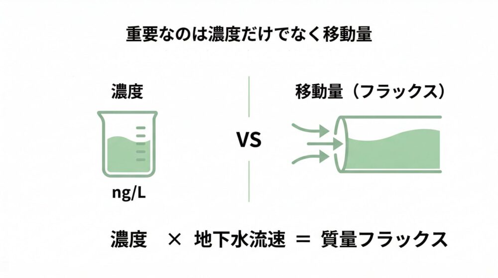 地下水汚染の評価で見落とされがちなのが、移動量(フラックス)の視点です。